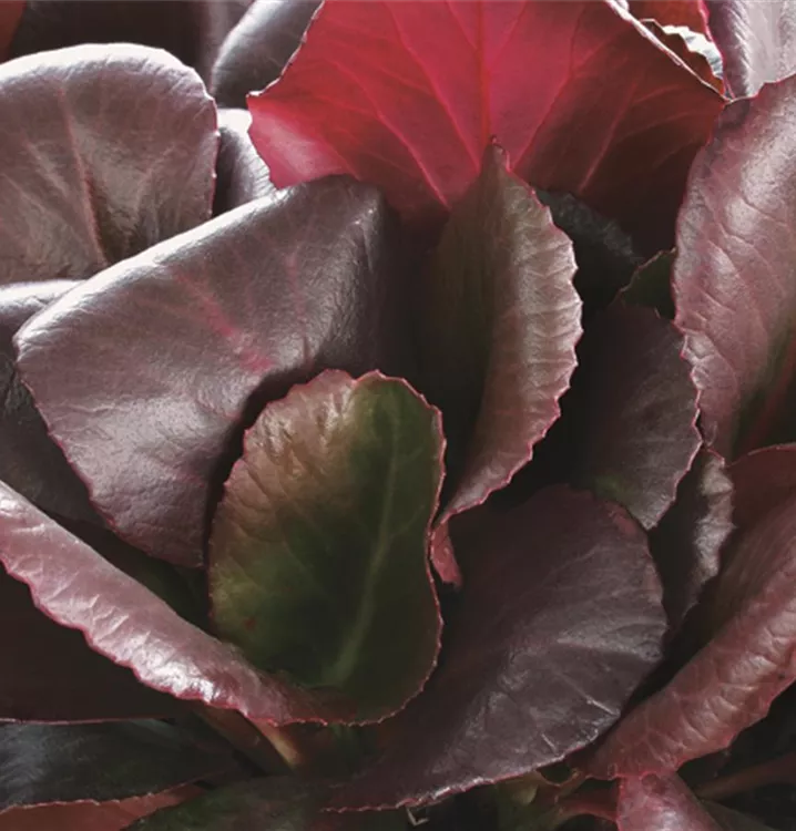 Hoher Blattschmuckwert. Die wintergrünen Blätter der Garten-Bergenie 'Eroica' sind dunkelgrün, eiförmig. Mit seinem rot-braunen Laub setzt sie schöne Akzente im Winter.