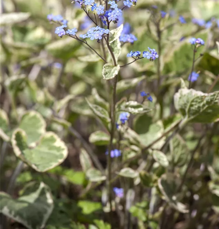 Brunnera macrophylla 'Hadspen Cream' bildet radförmige, in Rispen angeordnete, blaue Blüten ab April.