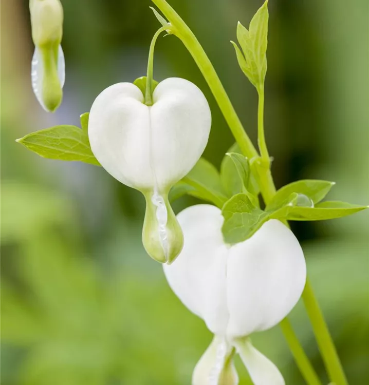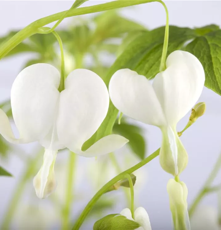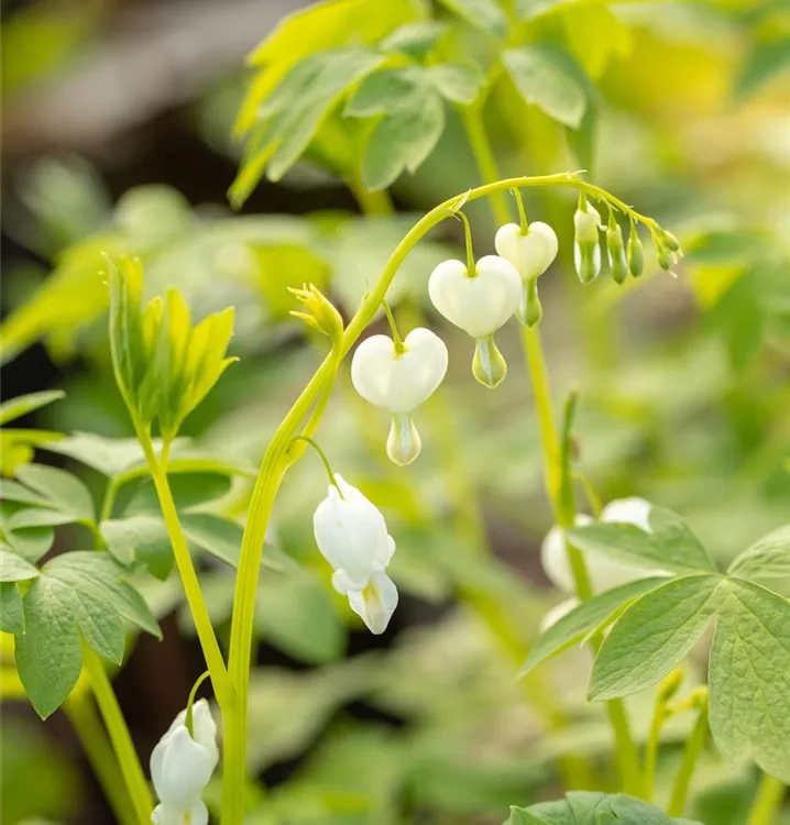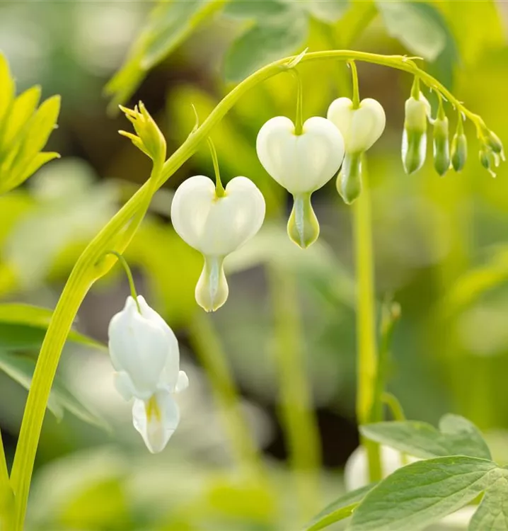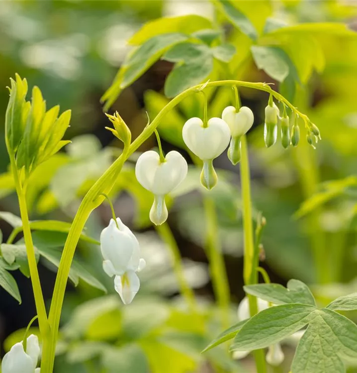 Dicentra spectabilis 'Alba' bildet in Trauben angeordnete, weiße Blüten ab Mai.