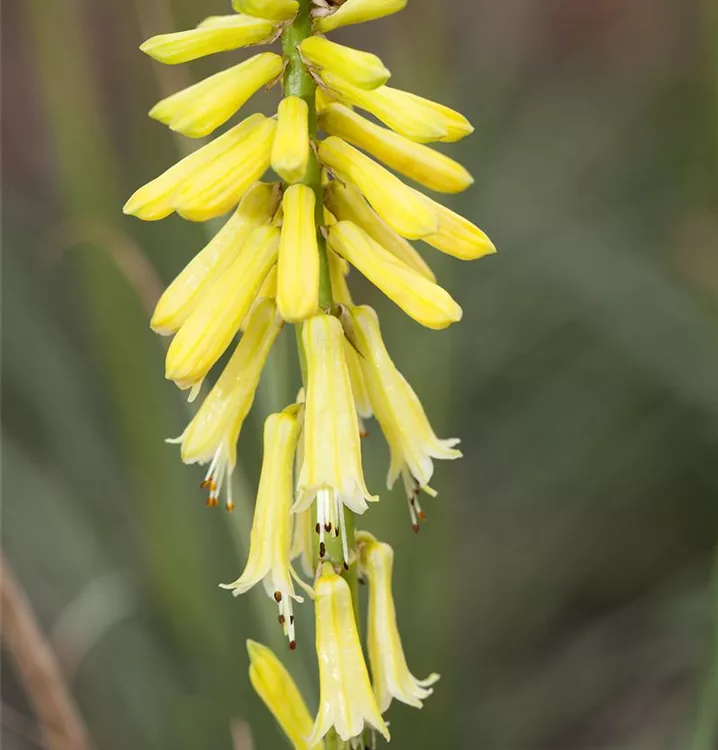 Kniphofia x hybrida, gelb bildet in Ähren angeordnete, gelbe Blüten ab Juni.
