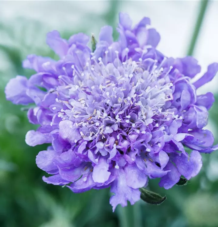 Scabiosa caucasica, blau bildet schalenförmige, blaue Blüten ab Juli.